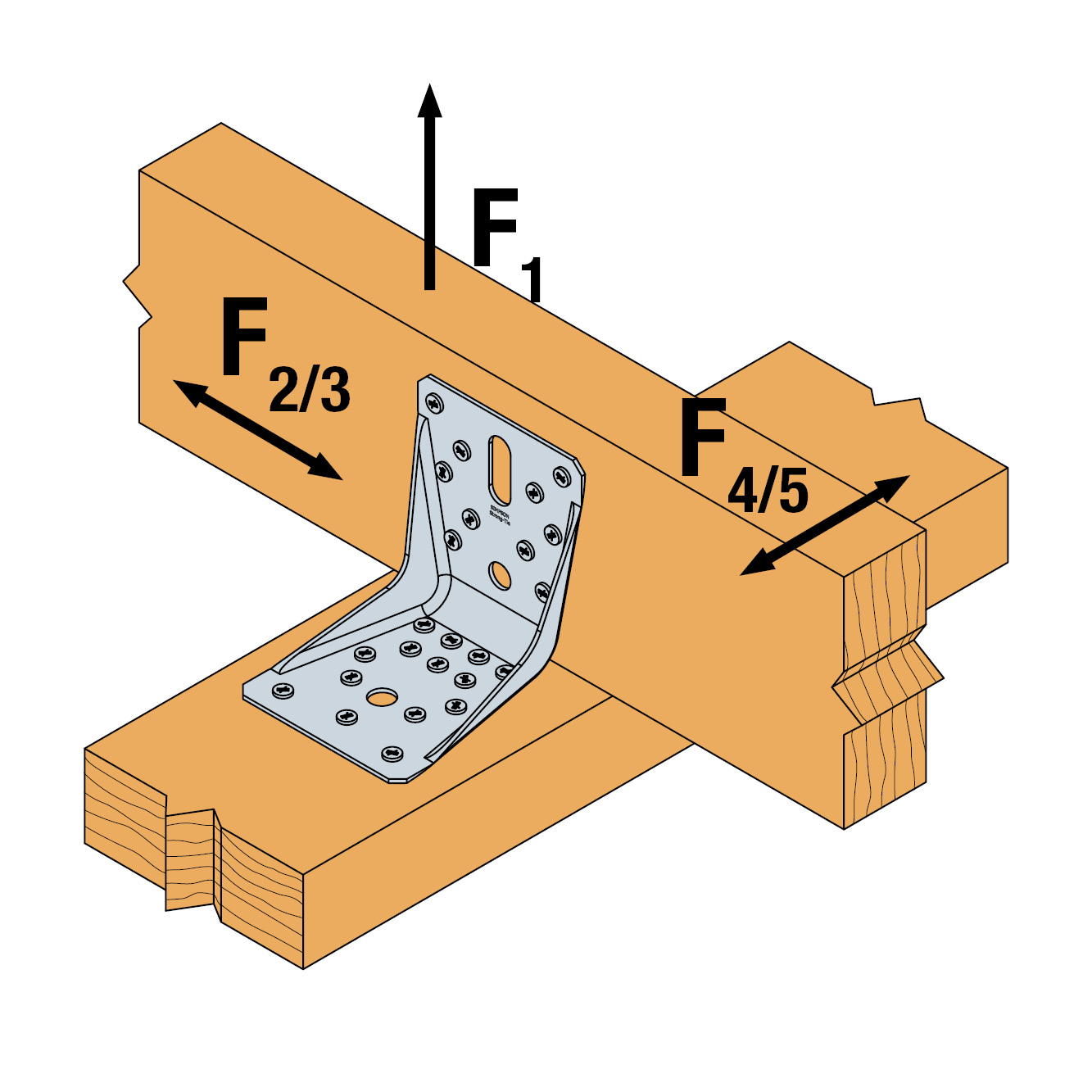 * Fare riferimento alle colonne della tabella delle capacità caratteristiche per il tipo di elementi di fissaggio che possono essere utilizzati sul lato A. Le capacità variano a seconda del tipo di fissaggio utilizzato. Per ottenere i valori di resistenza per un singolo angolare, i valori della tabella precedente devono essere divisi per due, a condizione che la trave supportata sia bloccata in rotazione. Se la trave è libera di ruotare, consultare il nostro ETA-06/0106.